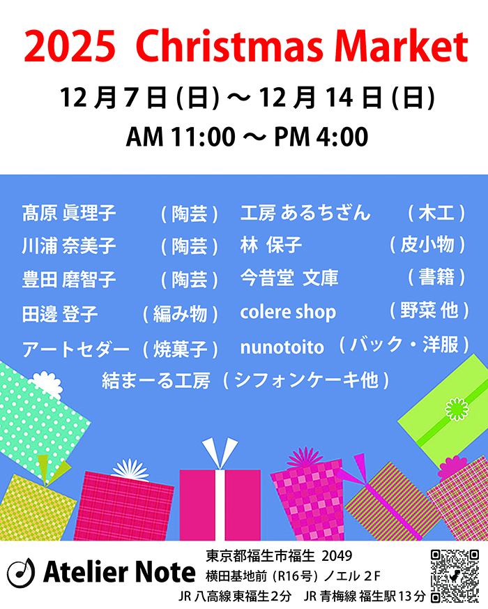 | 【 アトリエノート では 】 個展、グループ展、企画展、ワークショップ など 様々な企画にお応えできます。 展示に関する色々な事、お気軽にお問合せ下さい。 展示スペースの自由度が高く、什器も各種取り揃えてあり 作家さんの要望にお応えできます。 JR八高線 東福生駅から 徒歩2分、 JR青梅線 福生駅からでも 徒歩13分 と駅からも近く、 国道16号沿いで 横田米軍基地の前に アトリエ ノート はあります。 ◎ アトリエ ノート は あなたのお店です。 |